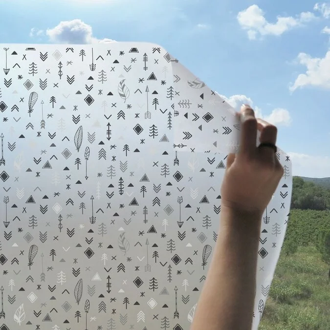 Trendy statisch raamfolie in bohemian stijl. Het statische glasfolie hecht niet door middel van een plaklaag maar hecht door middel van statische electriciteit. De breedte is 46cm, de lengte snijden wij per staffel van 50cm voor je op maat.